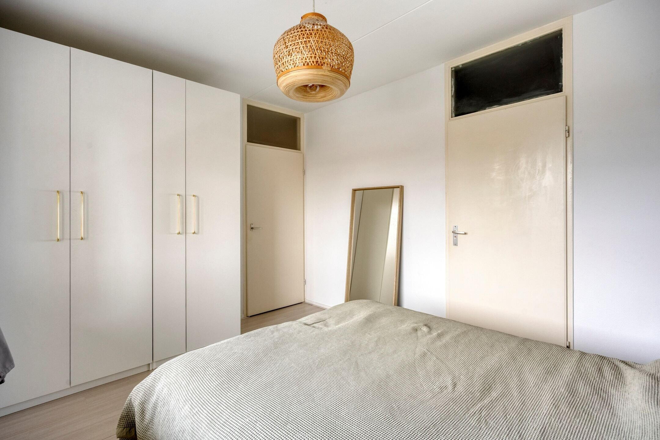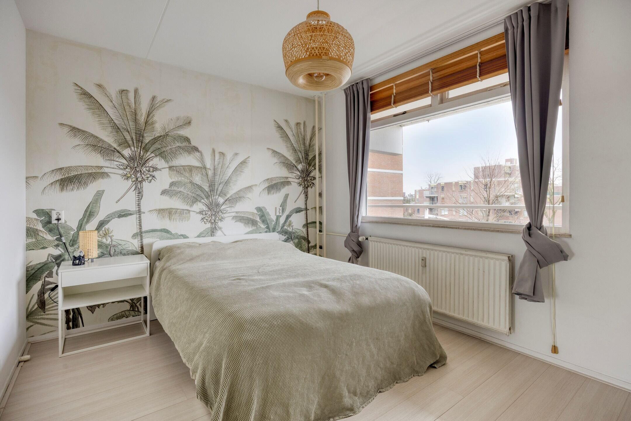 De ruime slaapkamer aan de achterzijde van het appartement biedt voldoende ruimte voor een tweepersoonsbed en kledingkasten. Het grote raam zorgt voor prettig licht en een aangenaam uitzicht.
