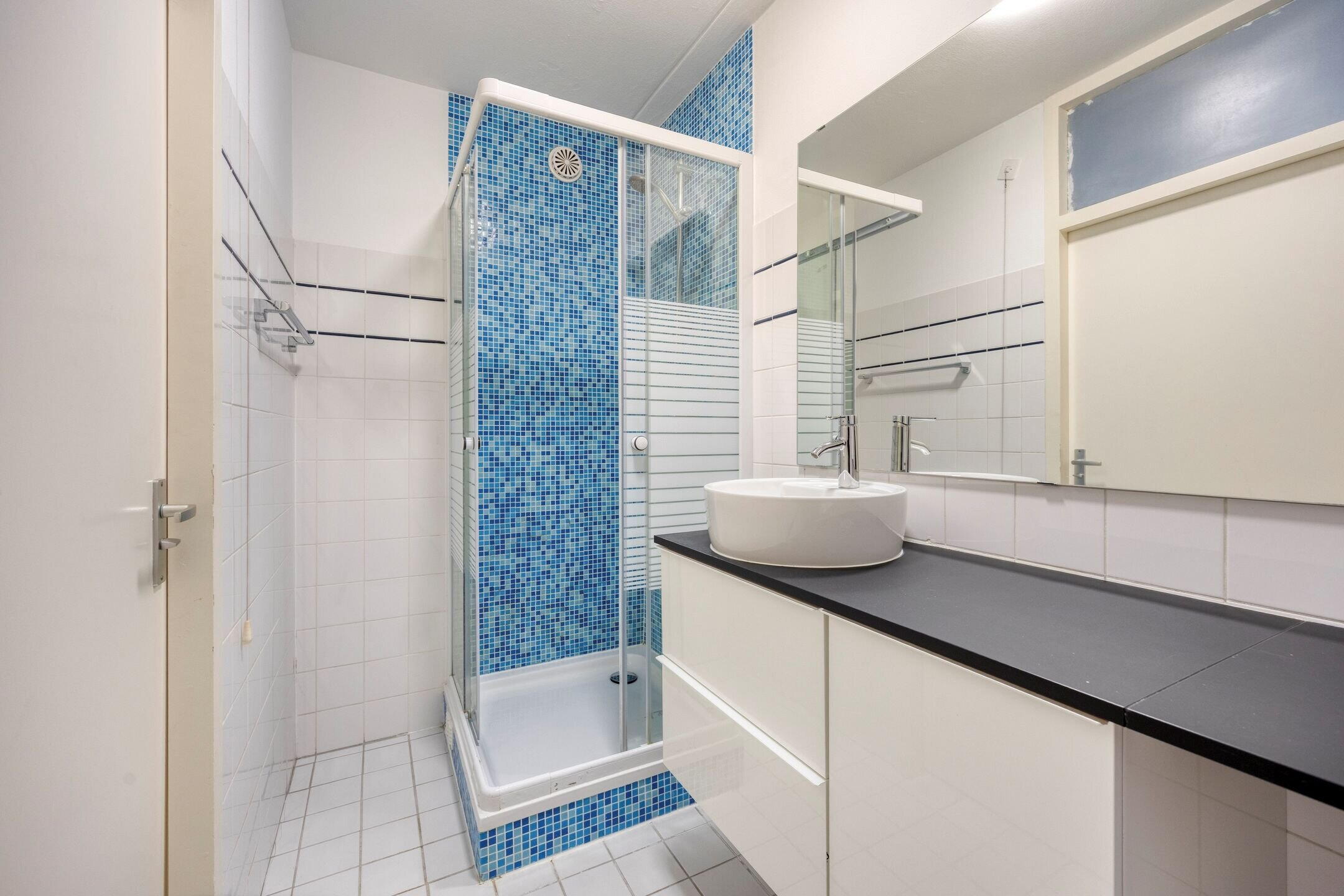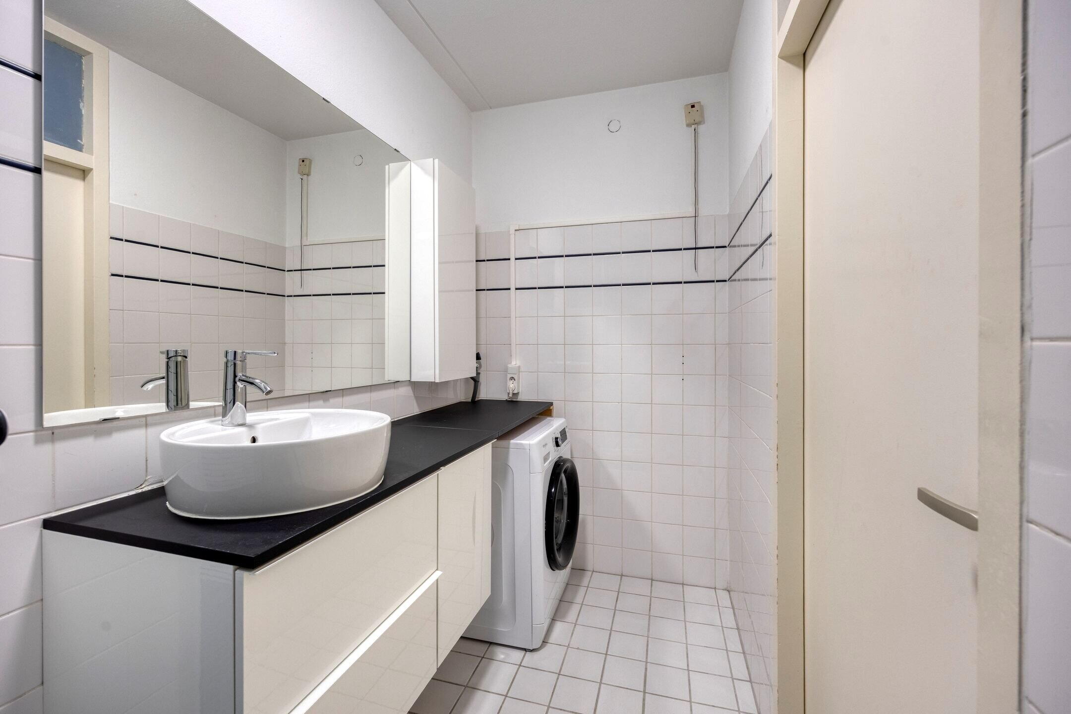De badkamer is voorzien van een douchecabine, een modern wastafelmeubel en een aansluiting voor de wasmachine. Het toilet is separaat aanwezig in de hal.