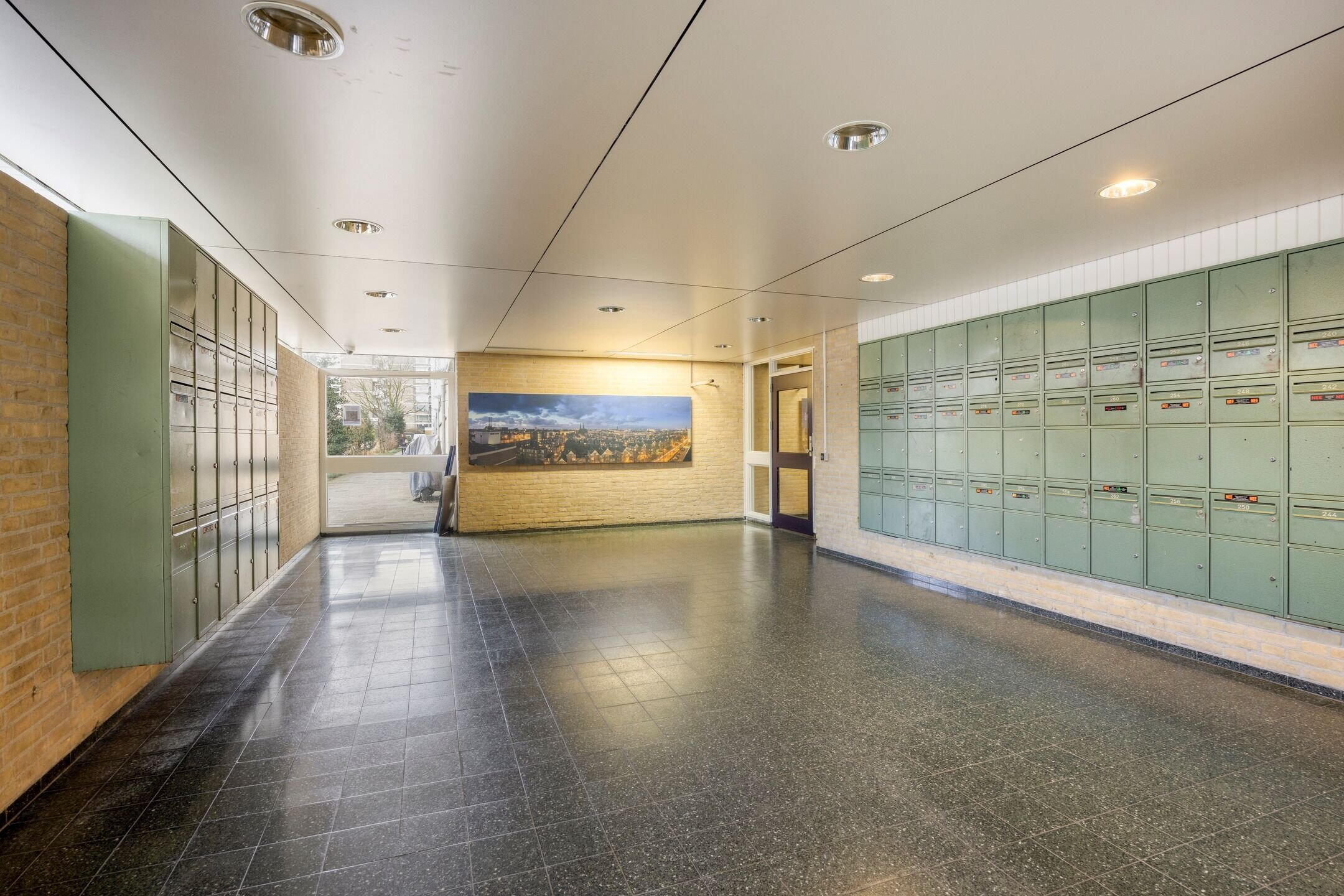 Via de gemeenschappelijke entree met bellentableau en brievenbussen bereik je met de lift of trap de 2e verdieping. Het appartement is gelegen op het einde van de galerij. Geen passerende medebewoners voor je raam dus!