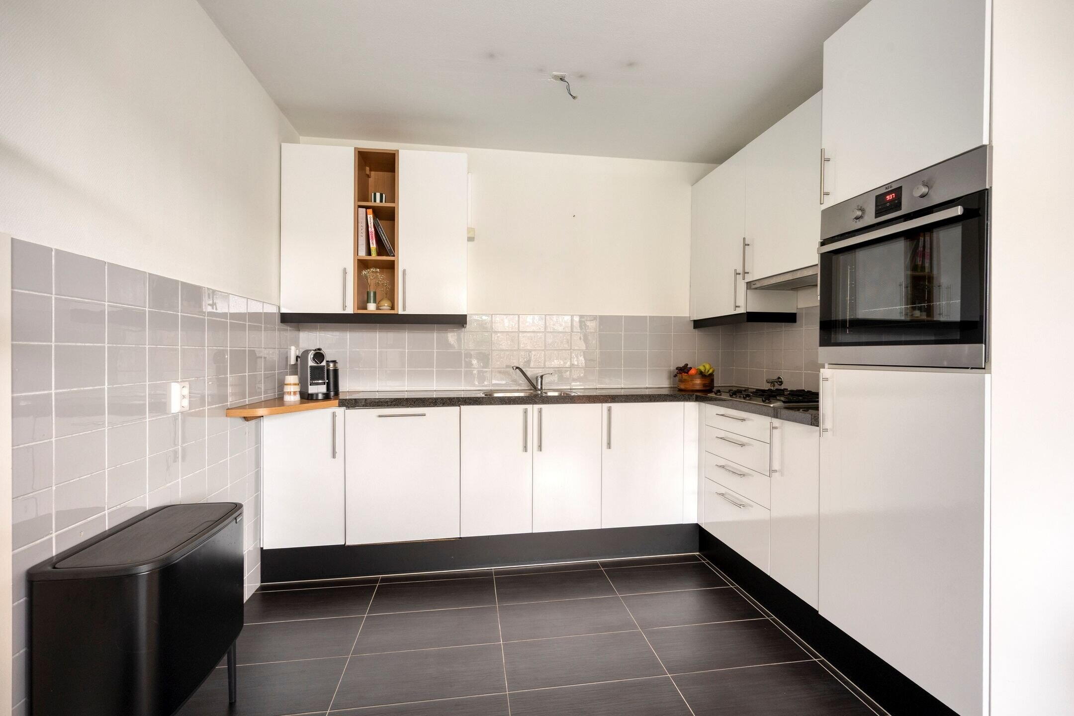 The generous, light-filled living room is situated at the rear of the apartment, featuring large windows that flood the space with natural light and offer a pleasant green view over the Kortenbos. There is ample space for a comfortable seating area and a dining area. Through the access door you step directly onto the large balcony (approx. 5.40 x 1.88 m), which faces south-east. The open L-shaped kitchen connects seamlessly to the living room and is well-equipped with a 4-burner gas hob, oven (AEG), dishwasher, refrigerator, and generous cabinet space.